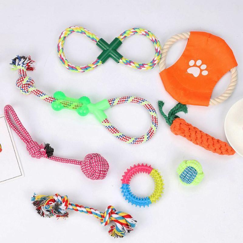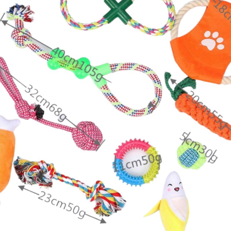 Todas las piezas que incluye este kit se pueden lavar. Mantén a tu mascota feliz y comprometida con nuestro Pack de Juguetes de 10 artículos. Con una cuerda en forma de pelota, otra en forma de zanahoria muchos otros modelos para llamar la atención de tu mejor amigo. Este pack mantendrá a su perro entretenido durante horas, ayudando a combatir el aburrimiento y a reducir el comportamiento destructivo en casa. Creemos que las mascotas sienten las mismas emociones que los humanos. Por eso nuestros juguetes están hechos de materiales súper resistentes e incluyen una cuerda para limpiar los dientes y ayudar a la ansiedad.